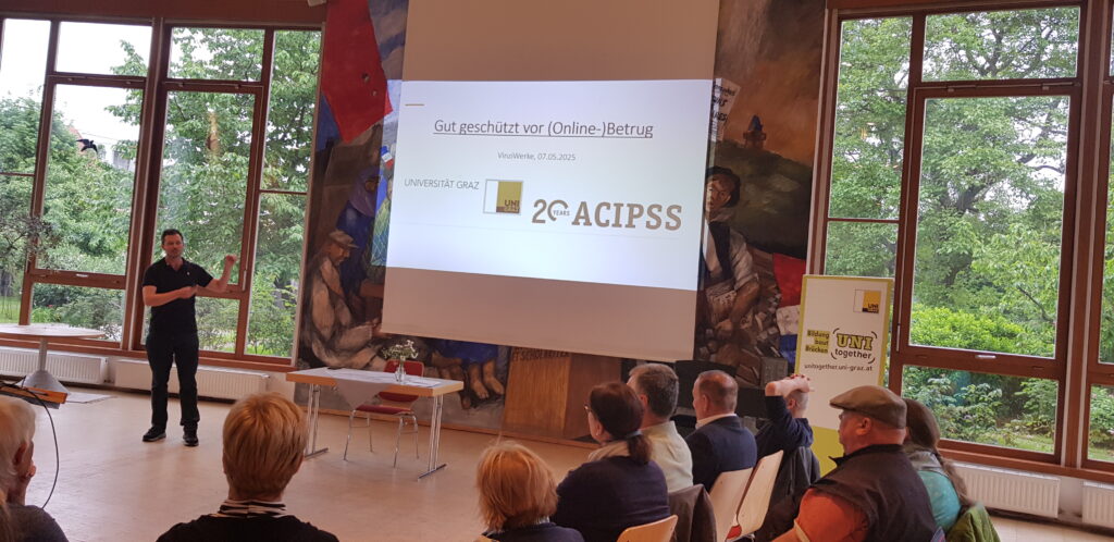 As part of the UNITogether program and in cooperation with the VinziWerke, Stefan Auer, in his function as ACIPSS researcher and with his additional expertise as head of the Security Information Center (SINFO), gave a lecture on May 7, 2025 in the St. Vinzenz parish hall for a colorful and numerous audience that conveyed scientific findings on manipulation, hidden technical dangers and criminal scams in a practical form, so that people continue to be safe from fraud attempts offline and online. Look at the rich program of UNITogether in the summer semester 2025 yourself: https://unitogether.uni-graz.at/de/unser-programm/